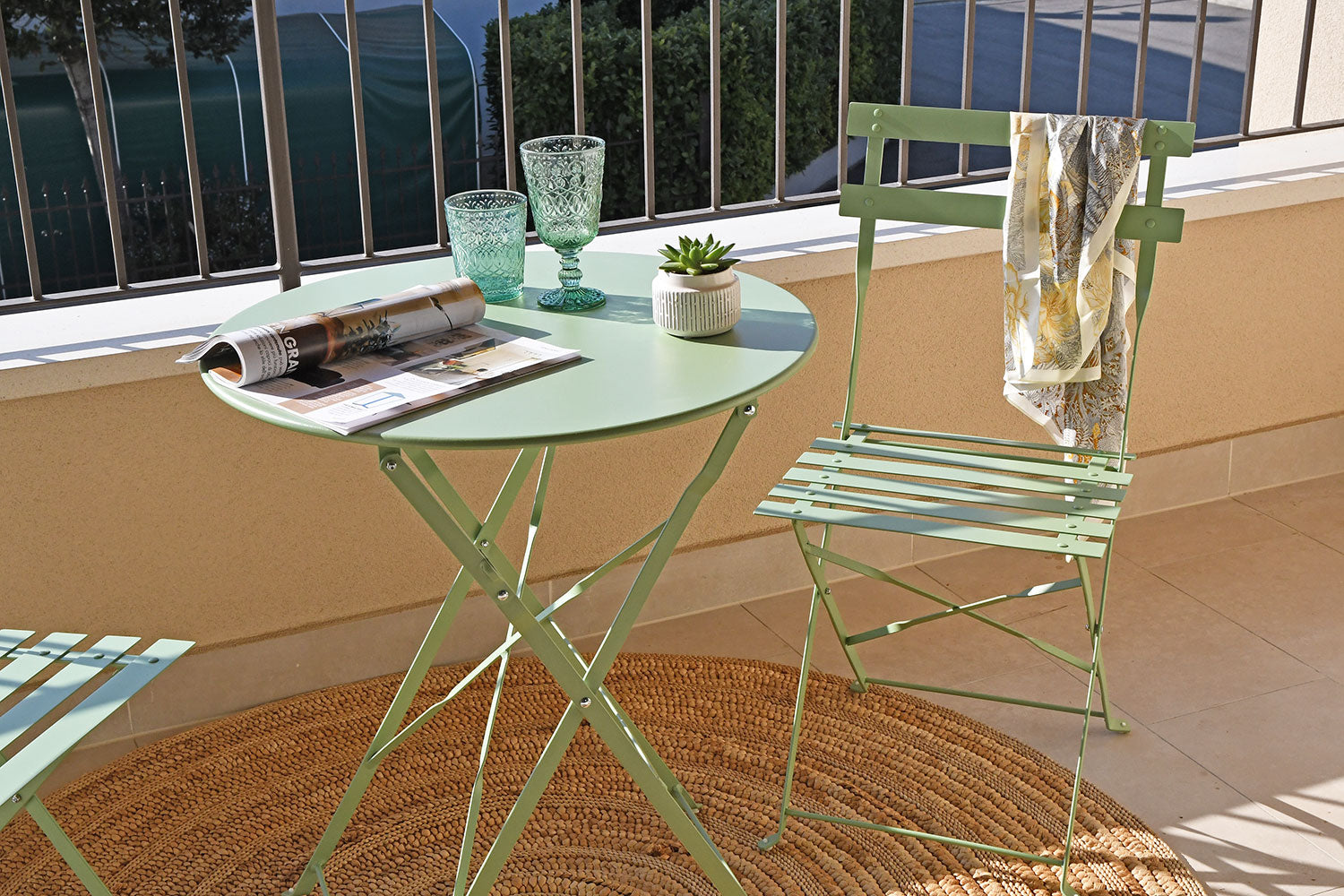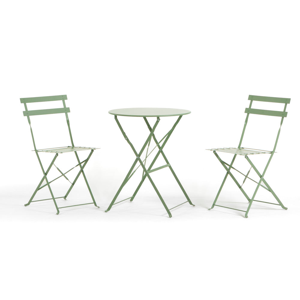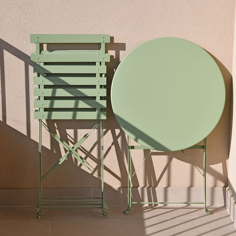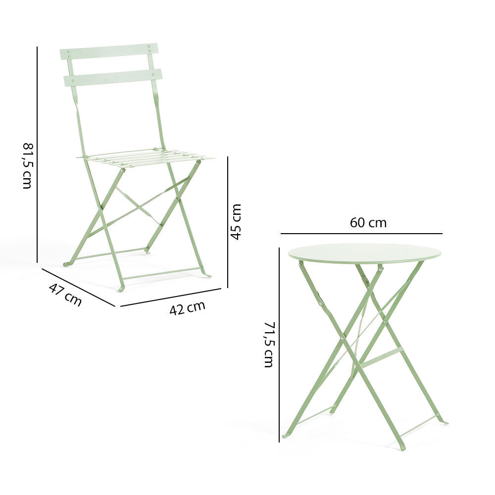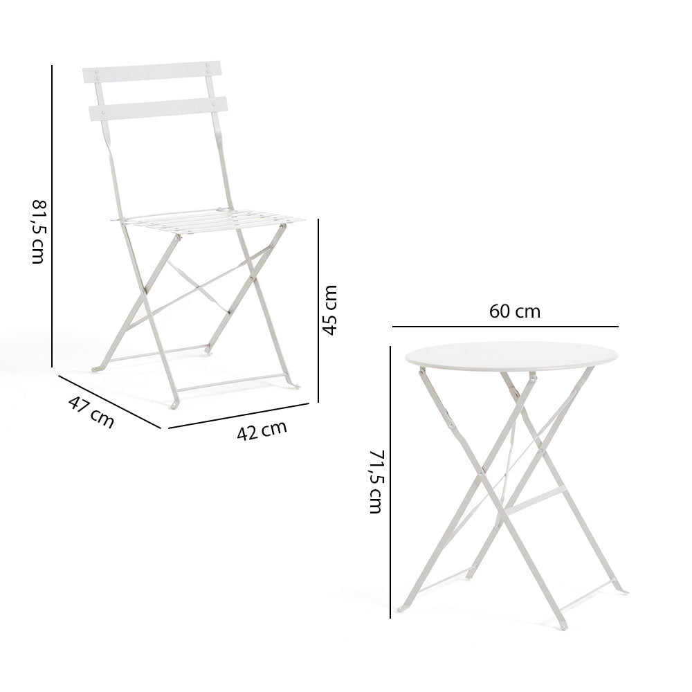 Sastoji se od dvije sklopive stolice i okruglog stolića promjera Ø60 cm. Ovaj set spaja eleganciju i funkcionalnost u kompaktan i profinjen dizajn, savršen za stvaranje ugodnog kutka na balkonima, terasama ili verandama.