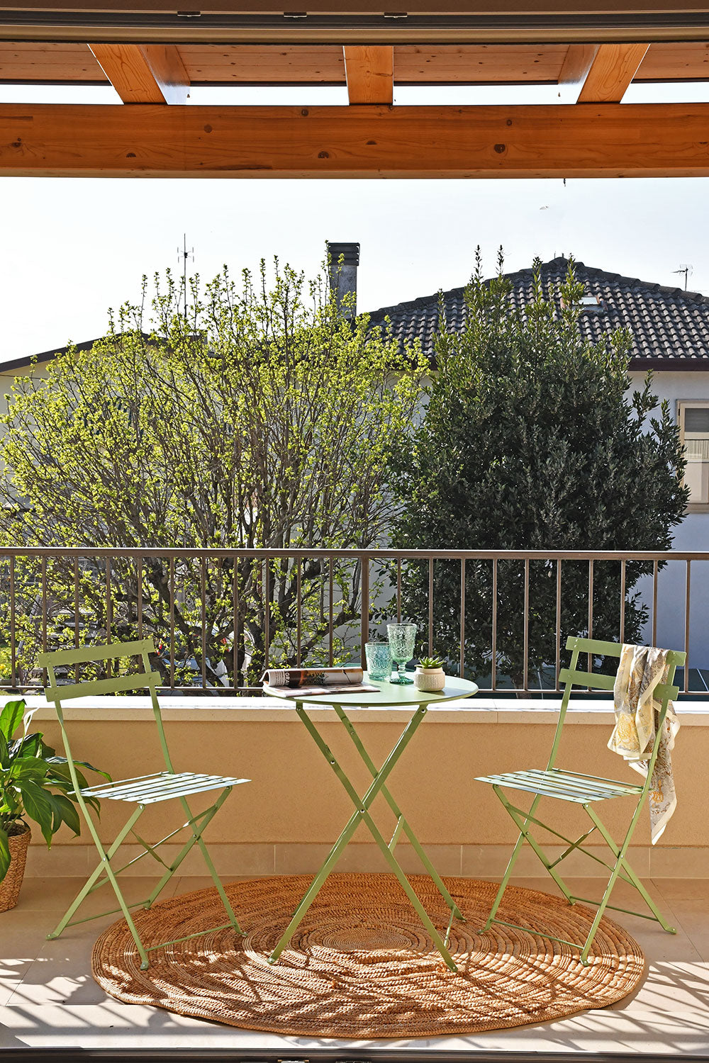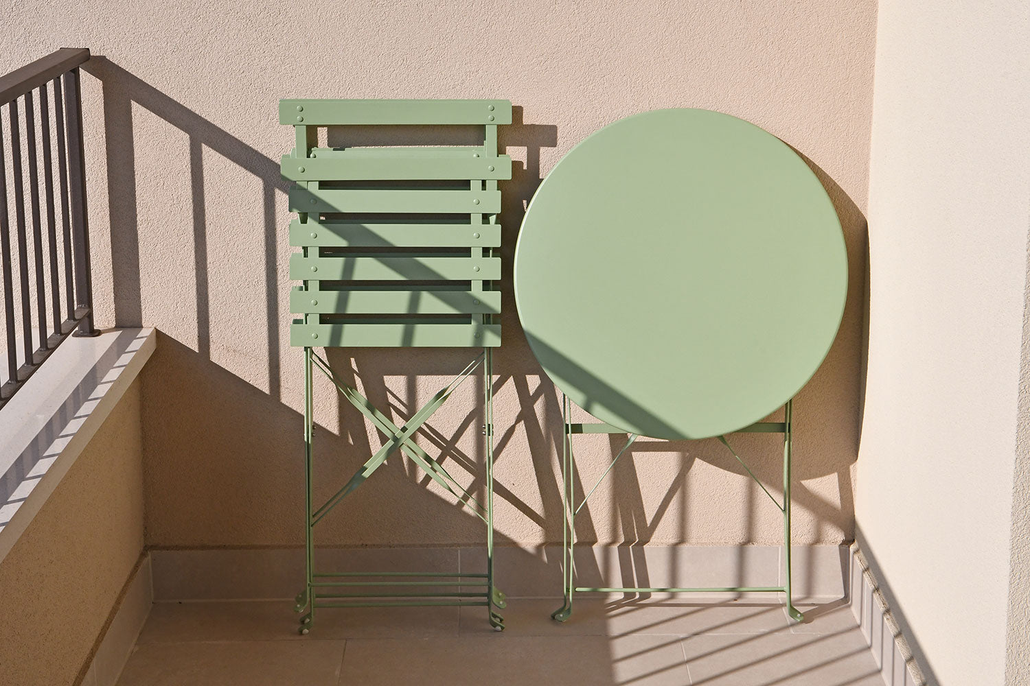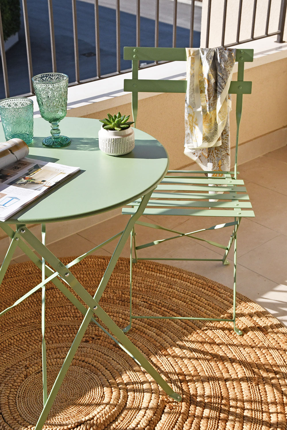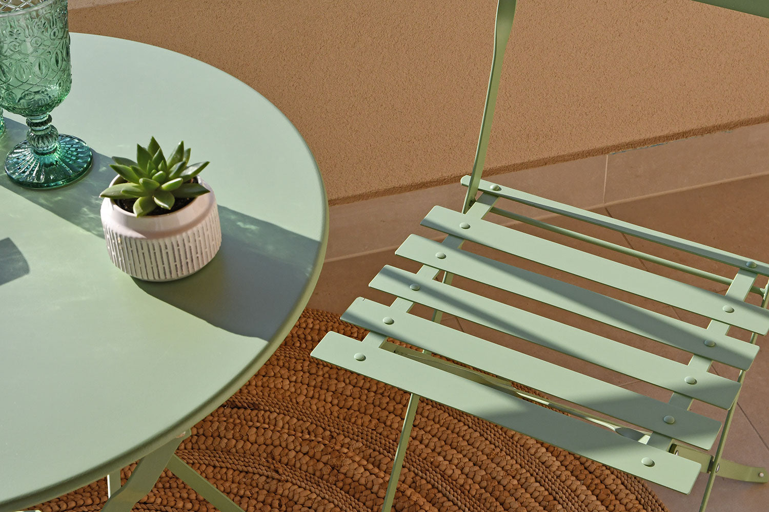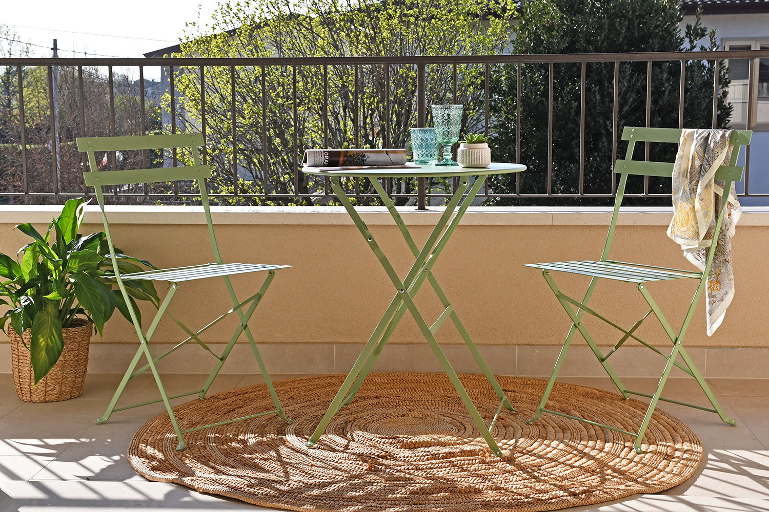 Sastoji se od dvije sklopive stolice i okruglog stolića promjera Ø60 cm. Ovaj set spaja eleganciju i funkcionalnost u kompaktan i profinjen dizajn, savršen za stvaranje ugodnog kutka na balkonima, terasama ili verandama.