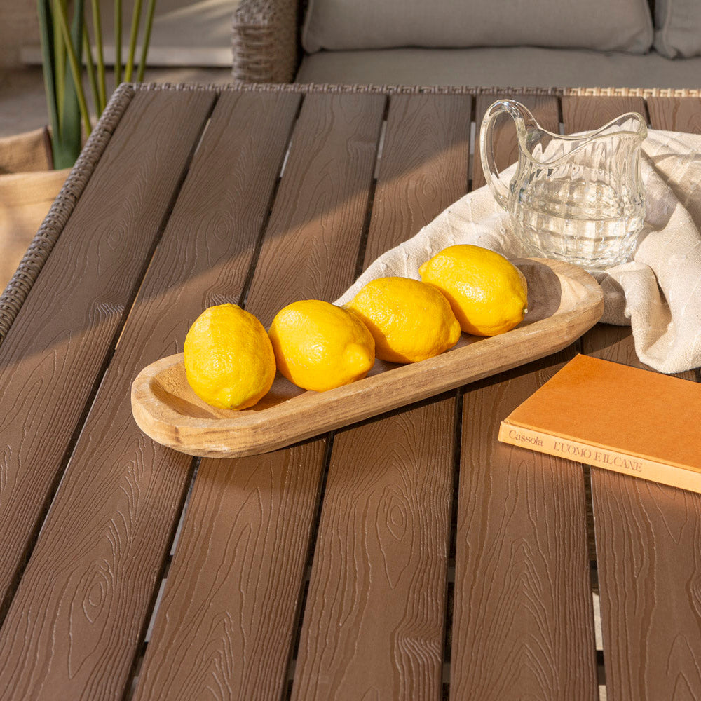 Stol (145x75 cm) upotpunjuje set elegantnim rubom i pločom od prirodnog poliwooda, savršenim za ručkove, aperitive ili jednostavne trenutke druženja u vrtu, terasi ili verandi.