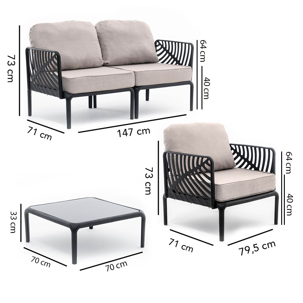 Set se sastoji od prostranog dvosjeda, dvije fotelje i stolića s pločom od kaljenog stakla, idealnog za upotpunjavanje vanjskog dnevnog prostora funkcionalnošću i elegancijom. Naziv Kenzia podsjeća na listove istoimene biljke, koji su poslužili kao inspiracija za poseban dizajn naslona za ruke, obilježen organskim i obavijajućim motivom koji cijelom setu daje lakoću i osobnost.