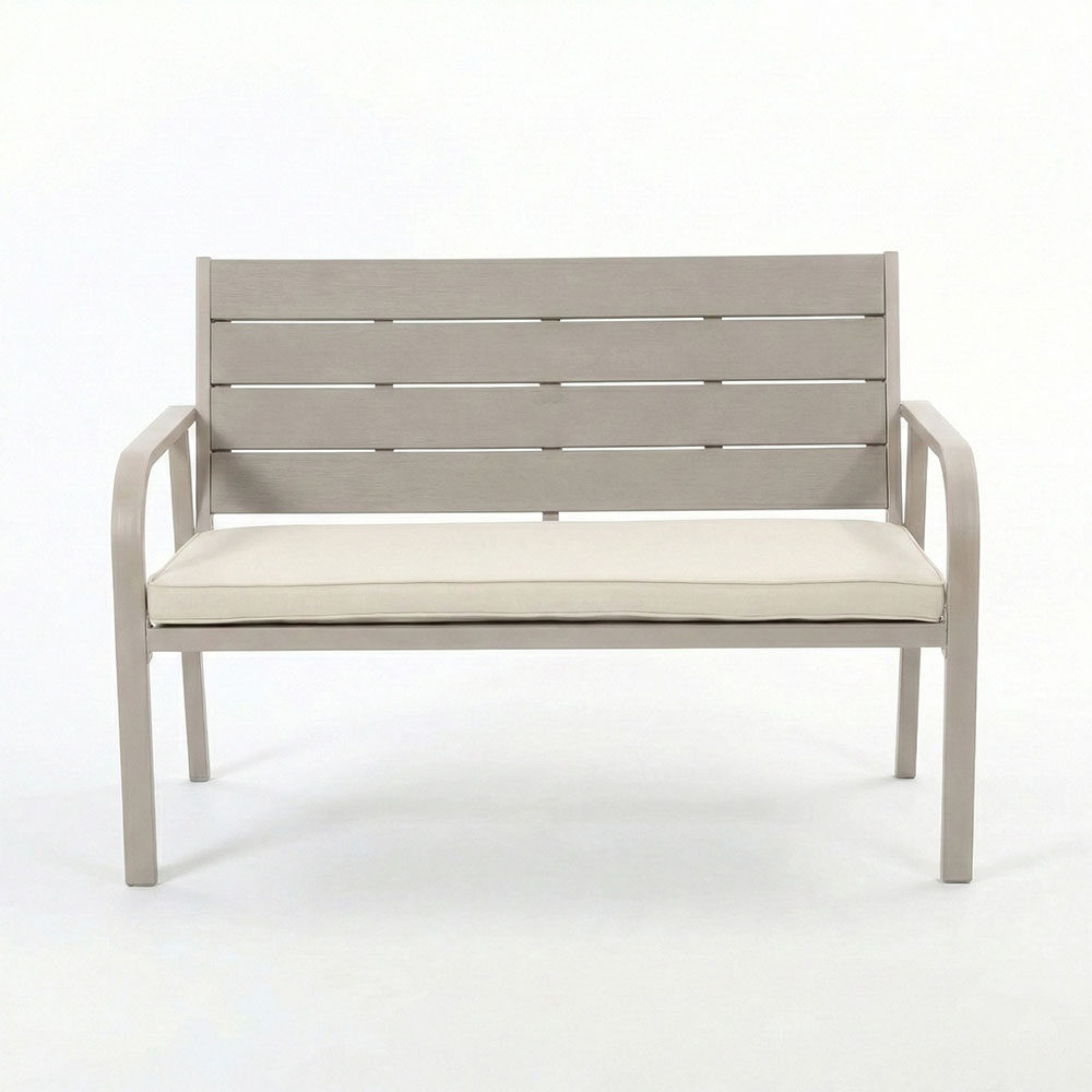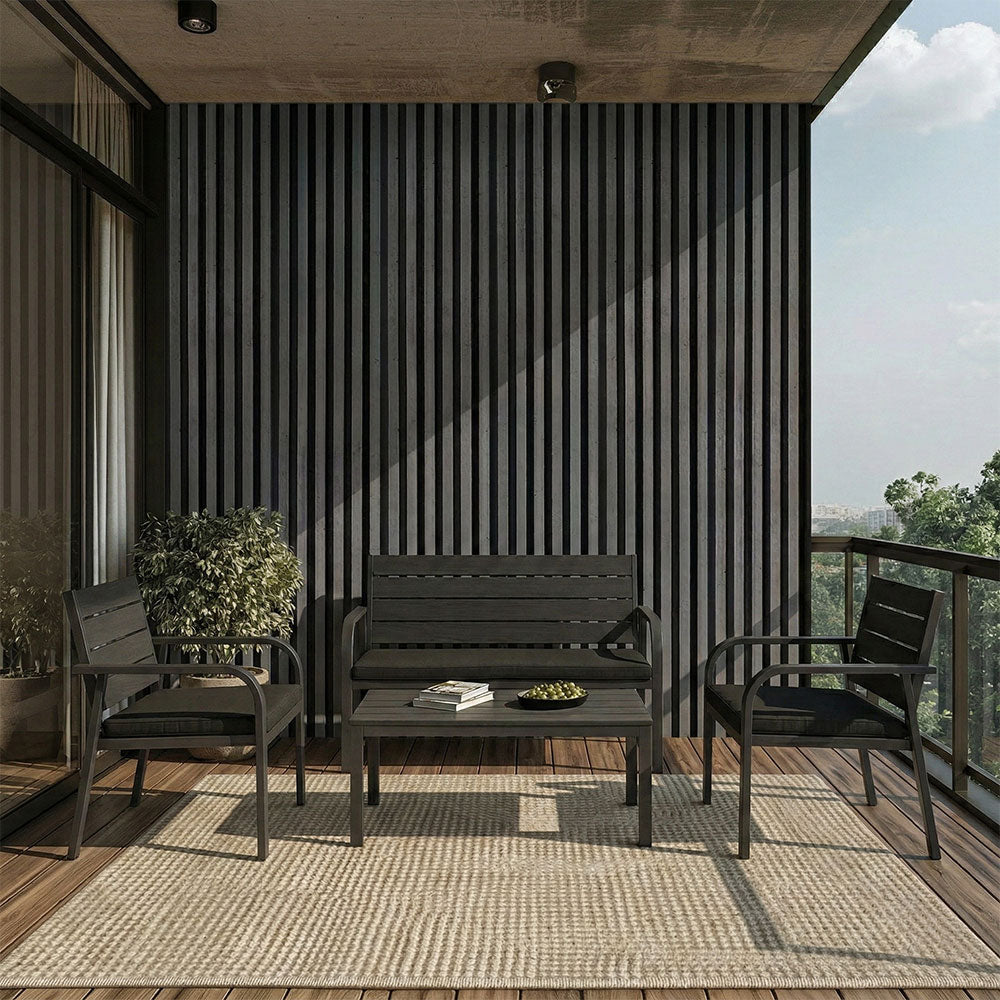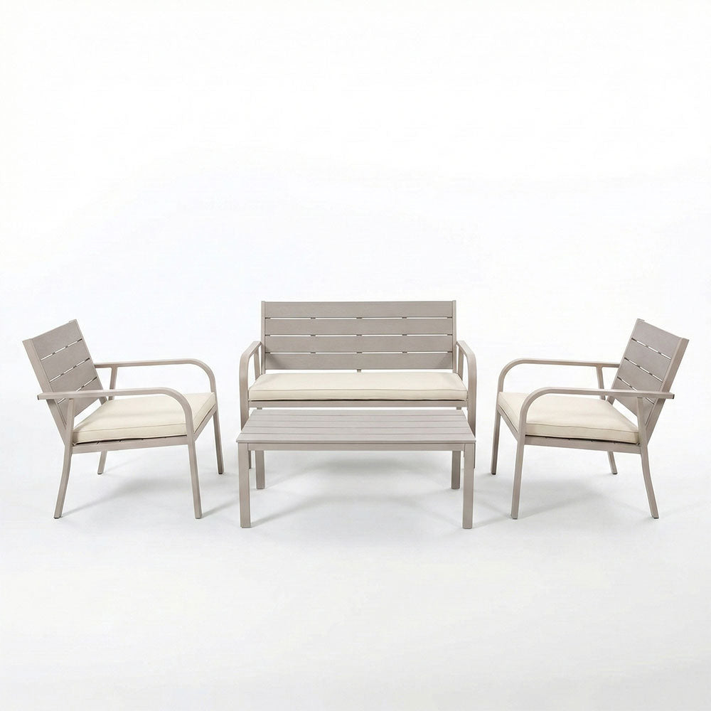 Set se sastoji od dvije fotelje, prostranog dvosjeda i stolića, sve s čvrstom i dugotrajnom konstrukcijom od metala. Sjedište i naslon fotelja i dvosjeda, kao i ploča stolića, izrađeni su od polietilena s efektom drva – praktičnog i otpornog materijala koji vjerno reproducira topao i prirodan izgled drva, bez potrebe za dodatnim održavanjem.