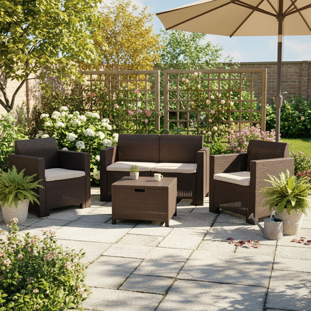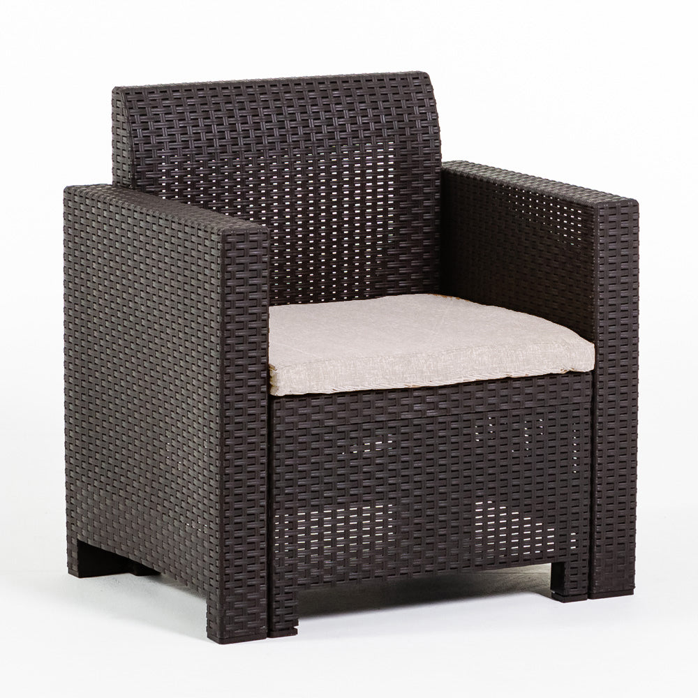 SALINA blagovaonski set od ratana , koji se sastoji od dvije fotelje, dvosjeda i stolića za kavu s prostorom za pohranu.